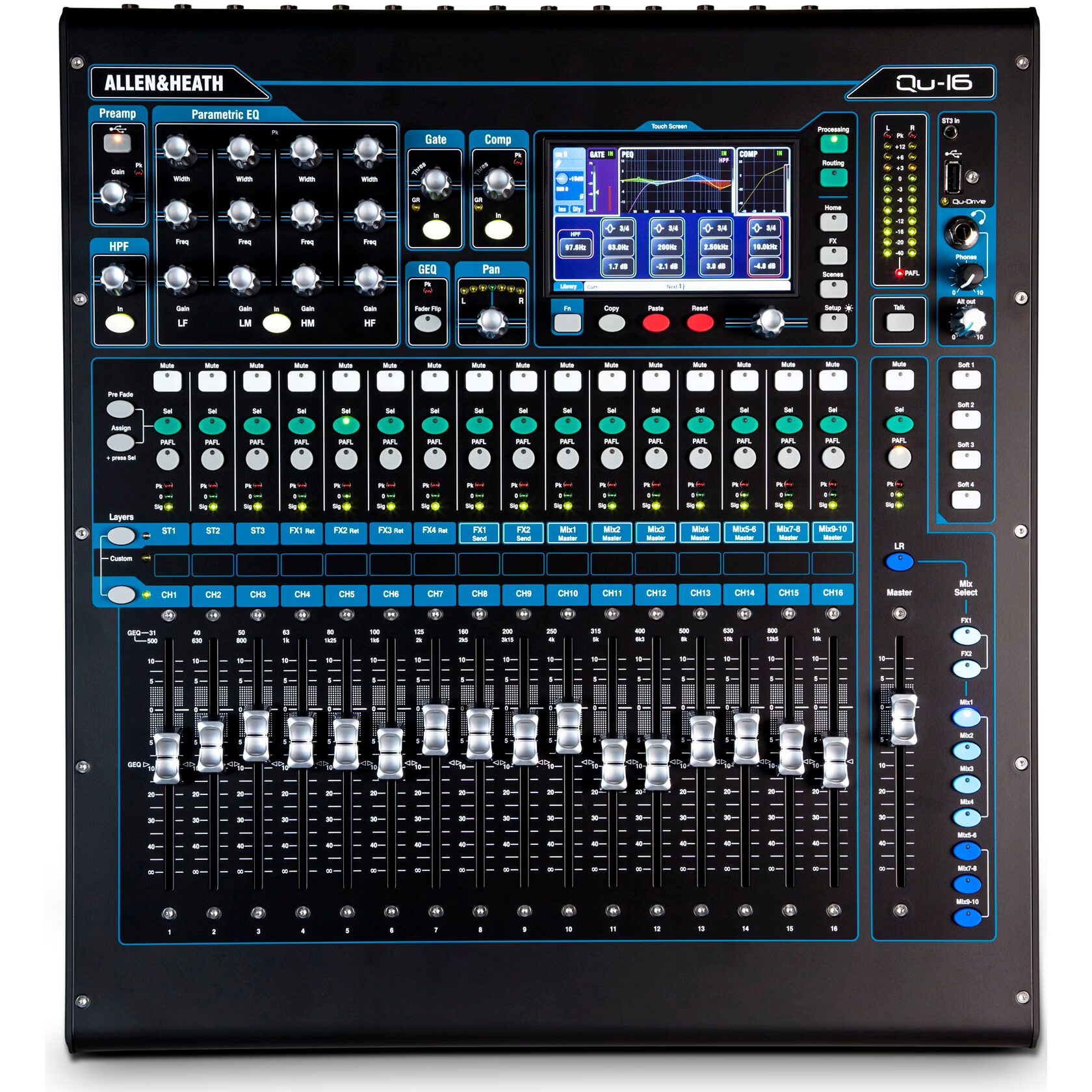 insert, 1/3-octave GEQ, compressor and delay on Main LR and Mono Mix outputs