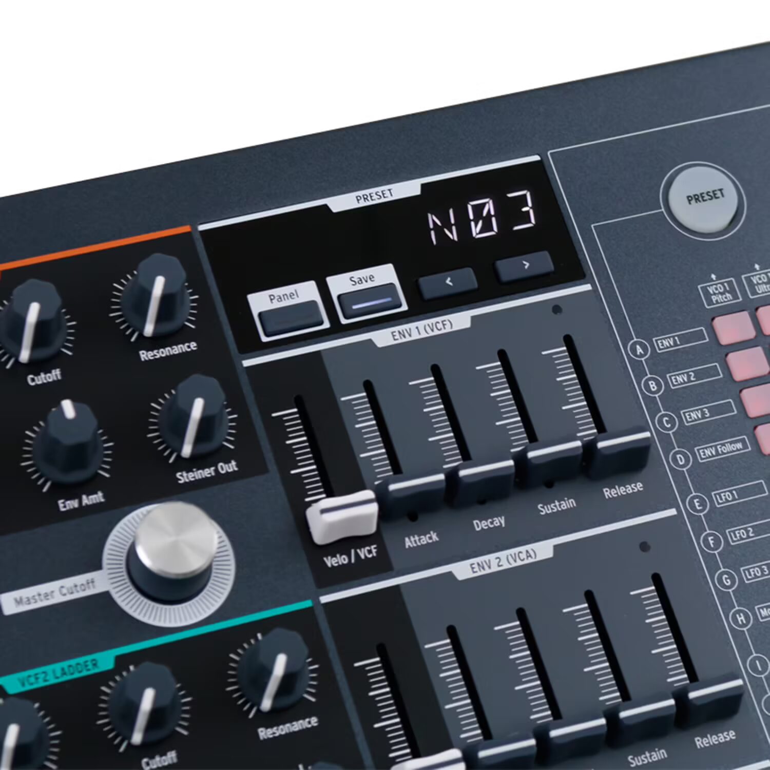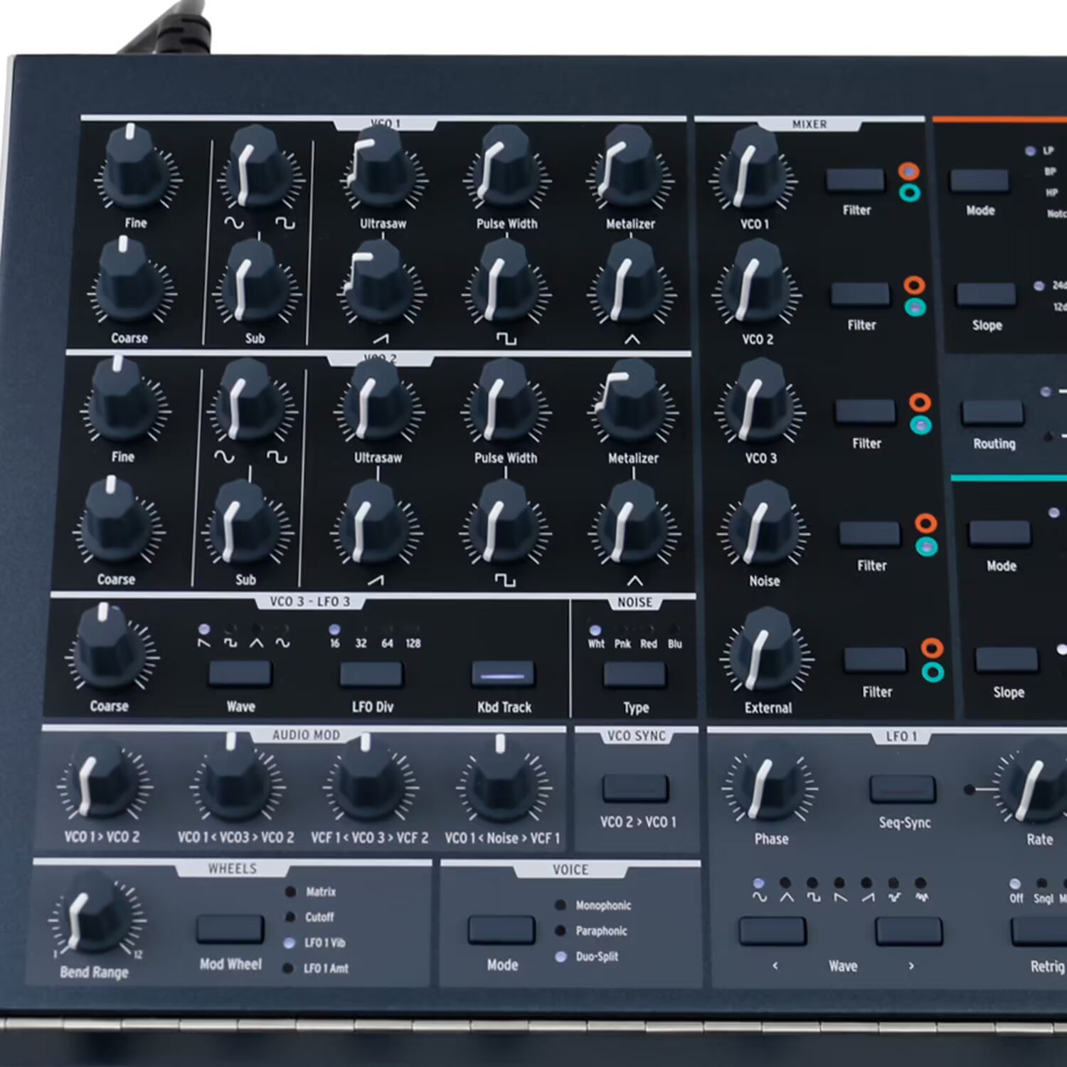 2x analogue exponential VCO’s: saw + ultrasaw, square + pulse width, triangle + metalizer, sub
