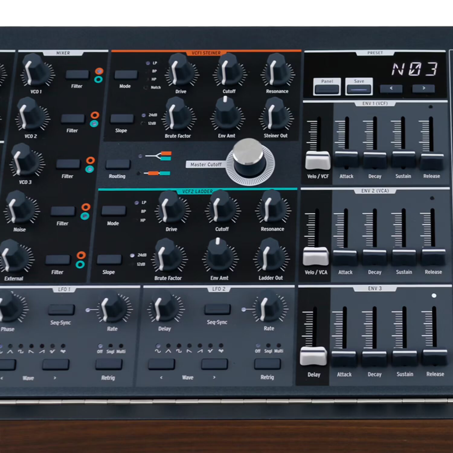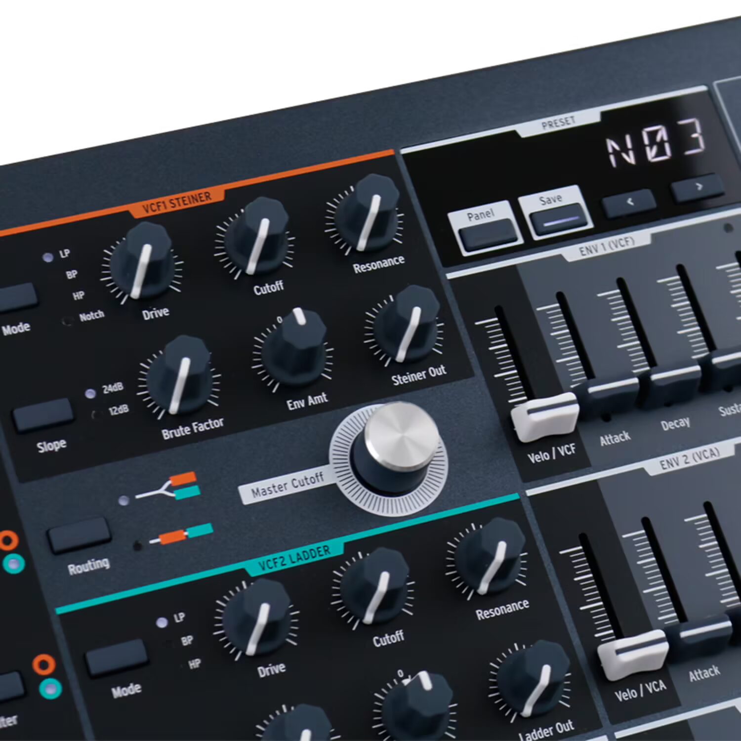Steiner Parker filter with 12 + 24 dB per octave modes; drive; brute factor; low pass, high pass, band pass, notch