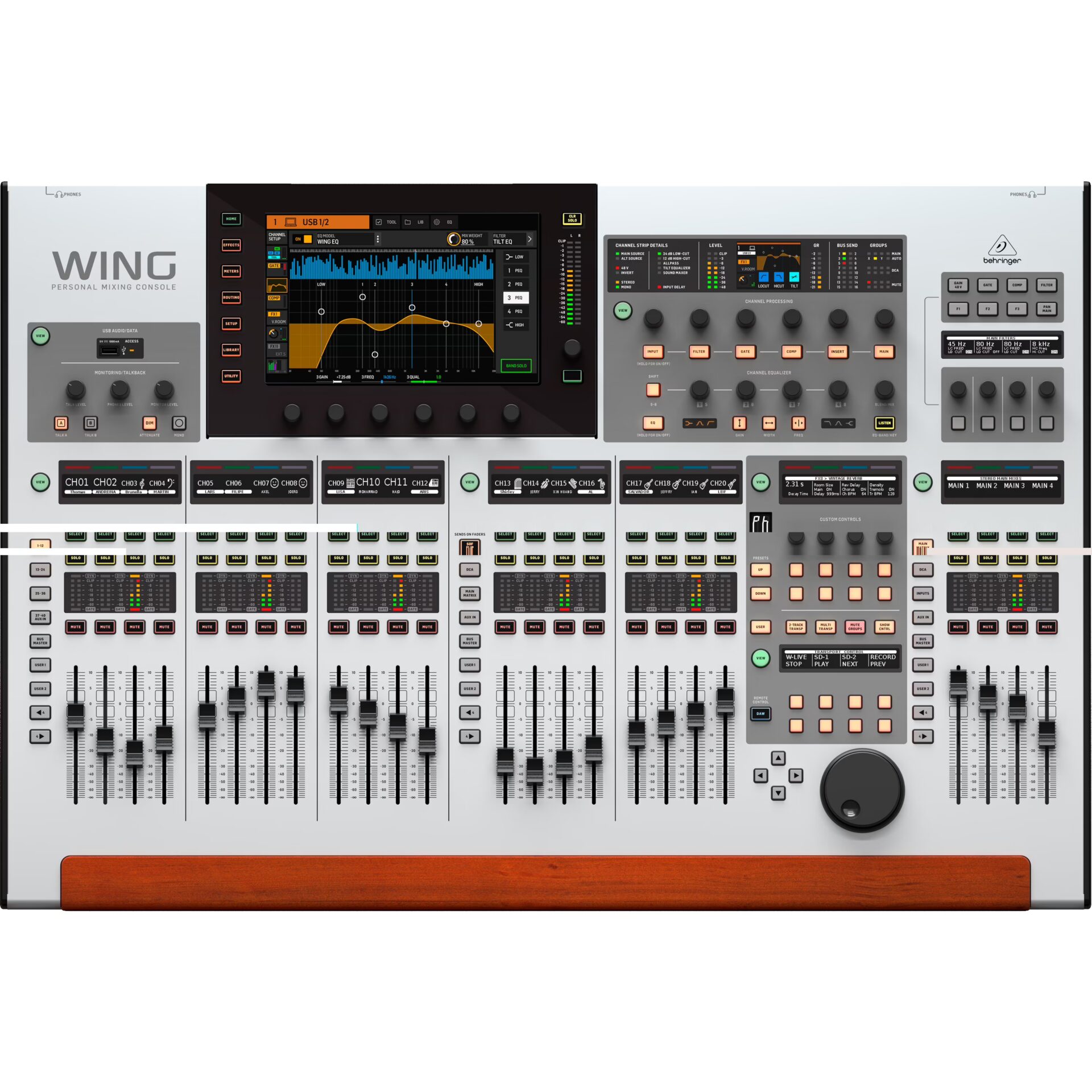 The Behringer Wing has a modular setup so that every input can be freely allocated to one of the 48 channels. The faders have an incredibly logical layout where the first twelve can be seen as channel faders, the subsequent eight as sub-groups and the final four can be used as the output section. But, since this is a modular setup, there’s nothing to stop you from completely ignoring this layout. Also, and besides the Standard FX Rack that comes loaded in, the Wing also boasts top-shelf effects from no other than TC Electronic and Lexicon.