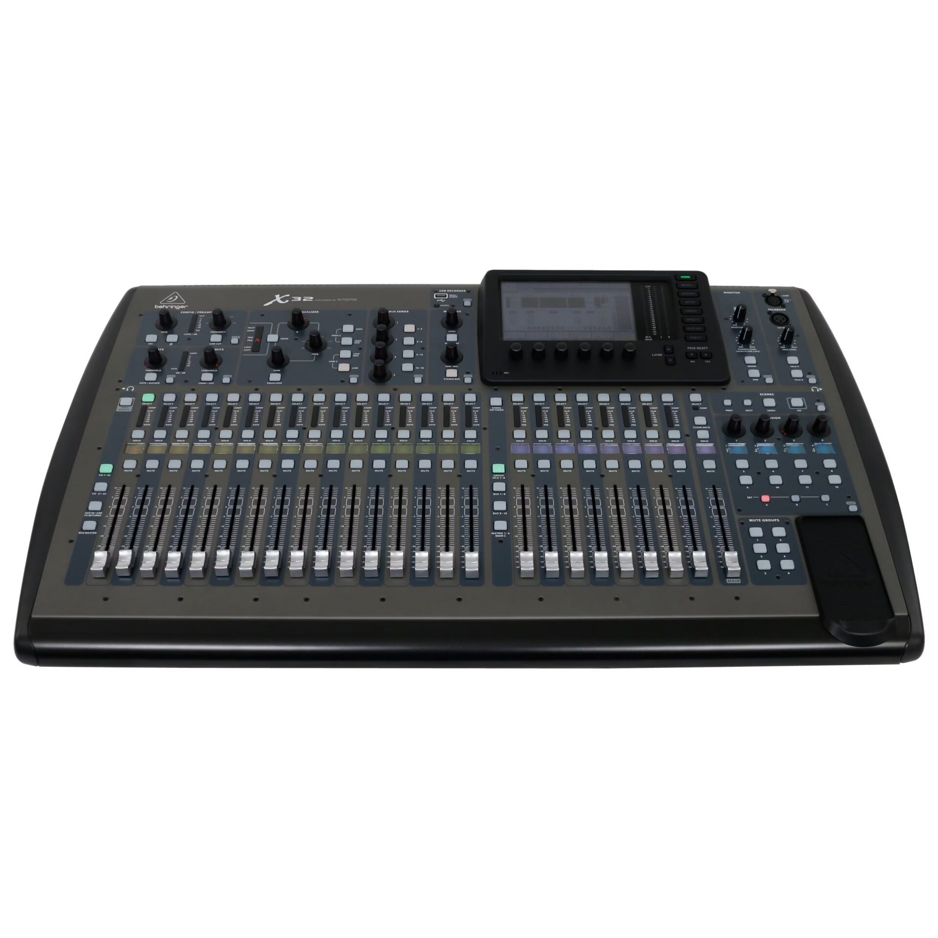The Behringer X32 is a 32-channel, 16-bus, digital mixer for studio and live purposes. It has everything you desire: 32 analogue inputs, 6 aux, motorized faders, and more. It also functions as a MIDI controller.