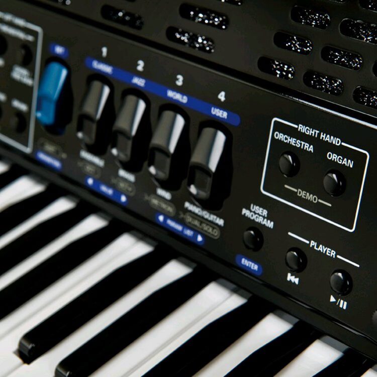 controls: Volume, 4x Treble/Orchestra/Organ register, SET register, Drum On/Off, Orchestra On/Off, Organ On/Off, Free Bass On/Off, Orchestra Bass On/Off, Orchestra Chord/Free Bass On/Off, User Programs On/Off, Wave/MP3 player: Reset/Stop, Play/Pause, Power, Play/Pause, Power