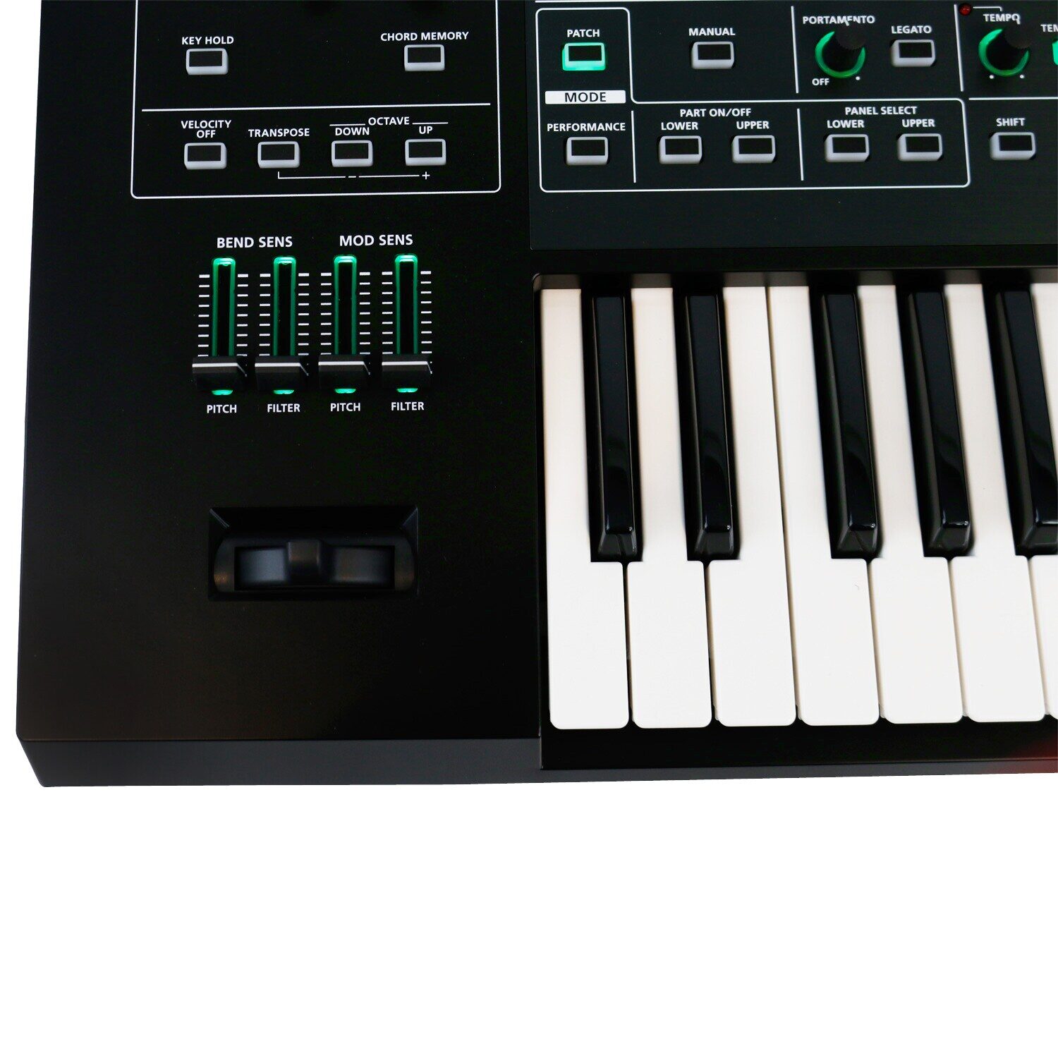 other control knobs: volume, input volume, arpeggio, chord memory, vocoder, keyhold, velocity off, transpose, octave
